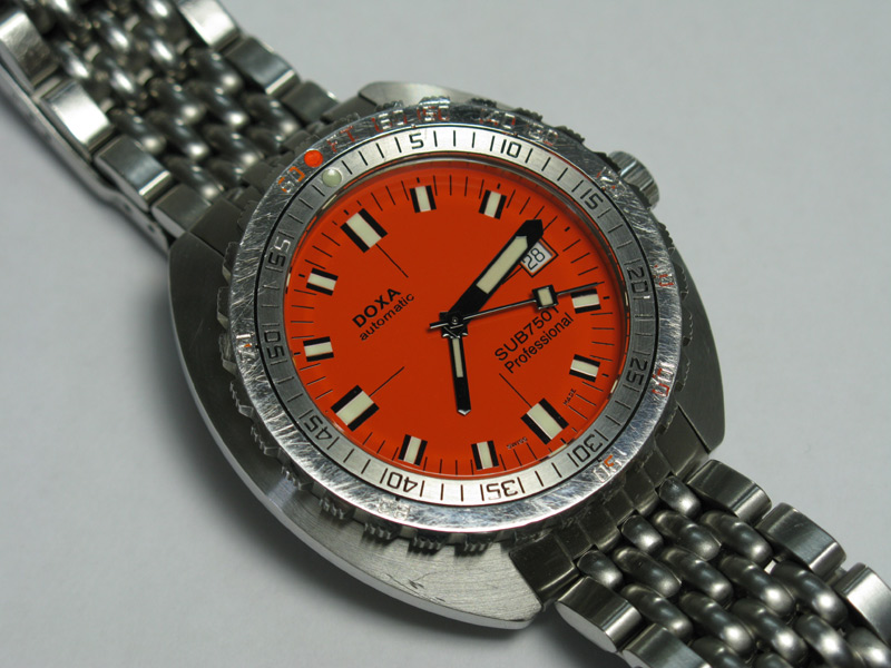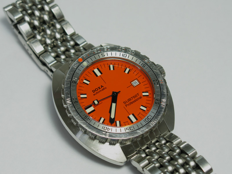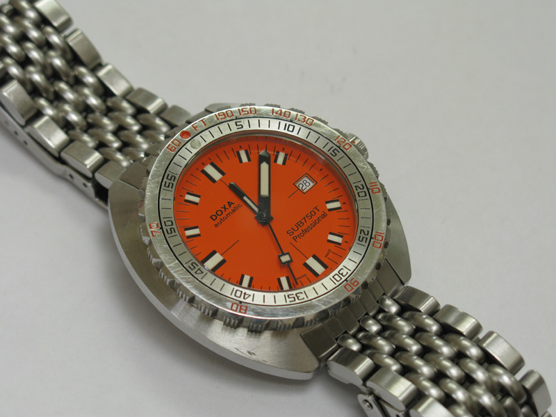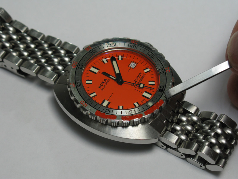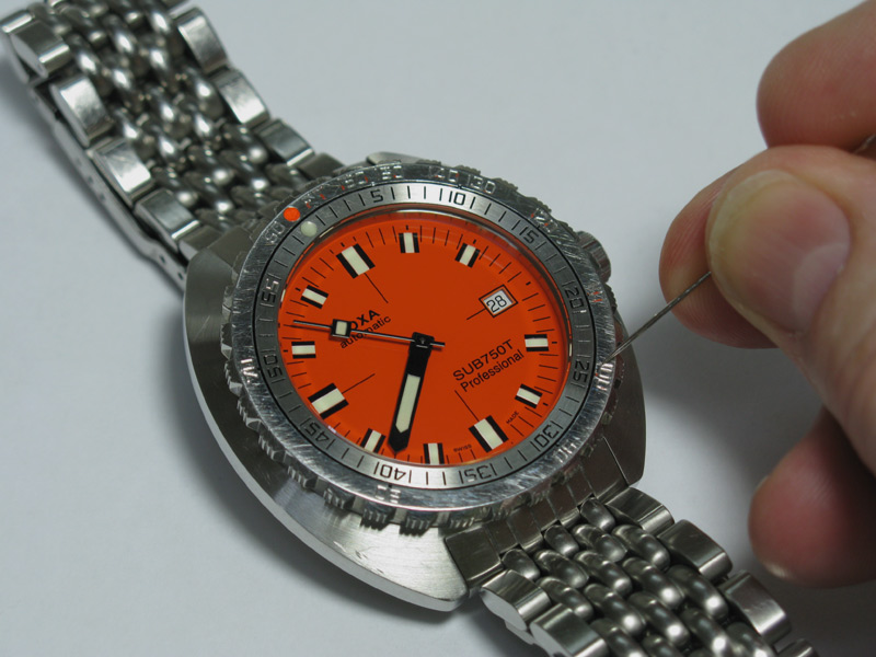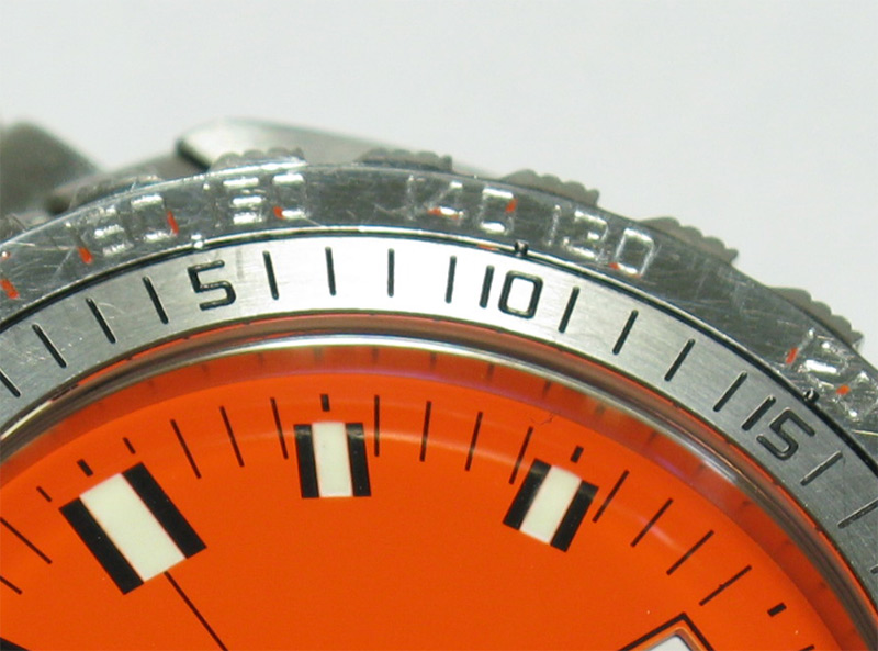 The thing that makes Doxa SUB watches different from just about every other dive watch is the Non Decompression bezel. The bezel is a one piece affair with the US navy dive table stamped into the face. On the orange dial Professionals, the depth numbers are painted orange and the time is in black. The fact that the bezel is highly polished, it is inevitable that it will pick up scratches over a period of time. the above image shows my watch after around 3 years of wear. Even with numerous scratches, it still looks good. The paint is still intact and everything is clear and legible.