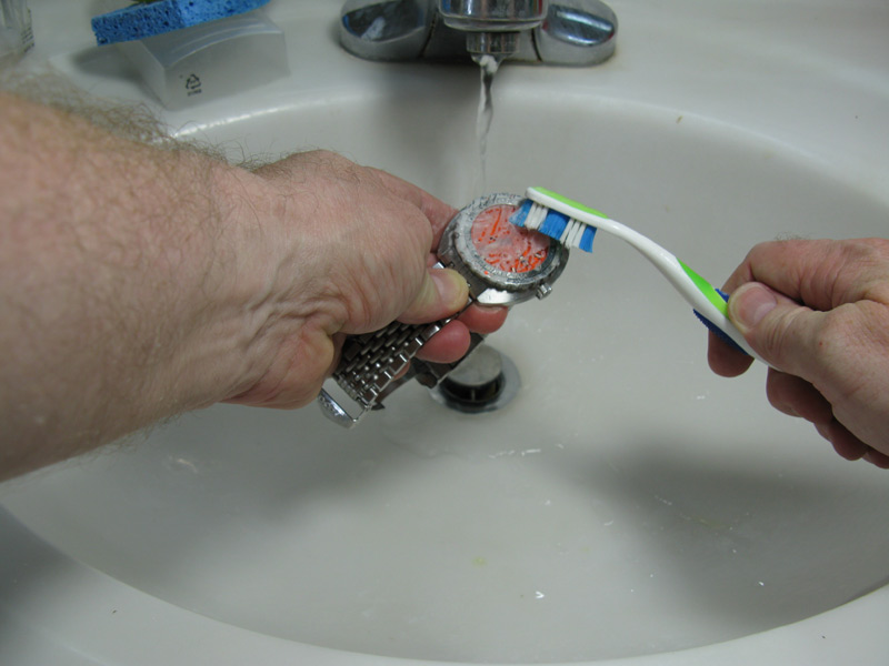 The first thing I did was clean the watch. I use a soft, fine bristle toothbrush and ordinary washing up liquid. WARNING........, make sure that if you do this, that the winding crown is screwed fully in and that the caseback is tight. Kinda embarrassing to flood your dive watch in the sink!!!!