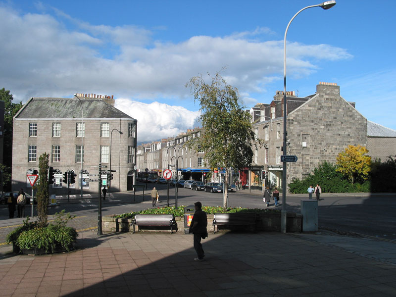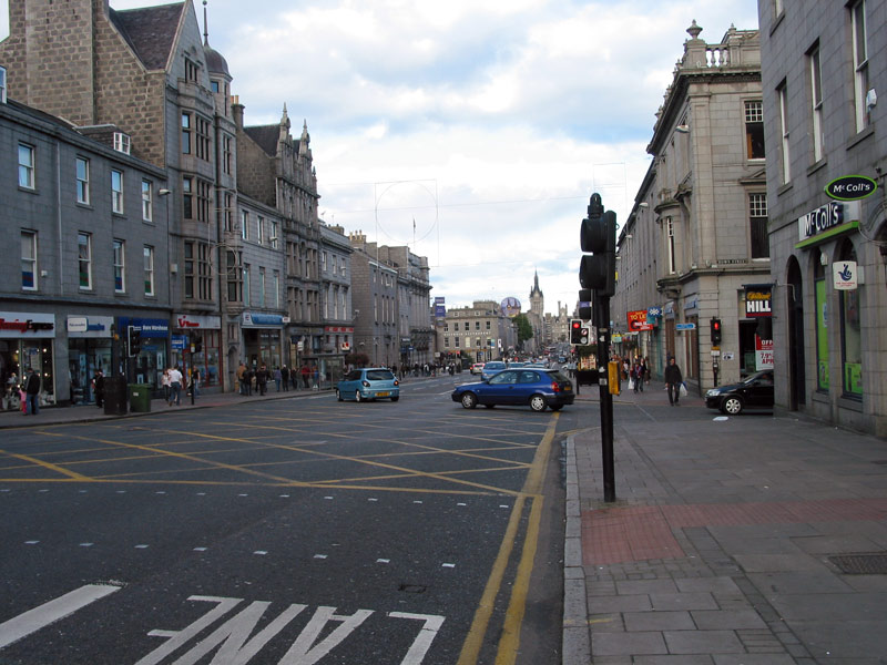 Around 200,000 people live in Aberdeen, a city that gained its Royal Charter in 1179. Aberdeen is called the 'Granite City' because just about everything is made of Granite. It tends to be a very gray city in the winter, but when the sun shines it sparkles because of the quartz in the stone. This picture shows the main shopping street - Union Street.