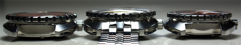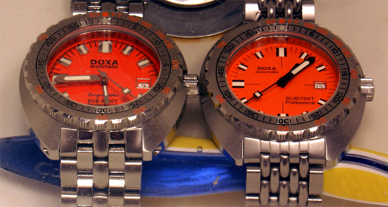 One of the aspects of a watch which always polarizes people is the shape of crystal used. Flat or domed? That is always a tough decision for a munufacture. The highly domed perspex crystal on the modern SUB 250 caused some consternation among the Doxa traditionalists. Likewise the moderately domed Sapphire crystal on the modern SUB 600T was a deal breaker for some but a welcome addition for others. The photo above shows profiles of the; (from left to right) SUB 750T, 5000T and 1000T.