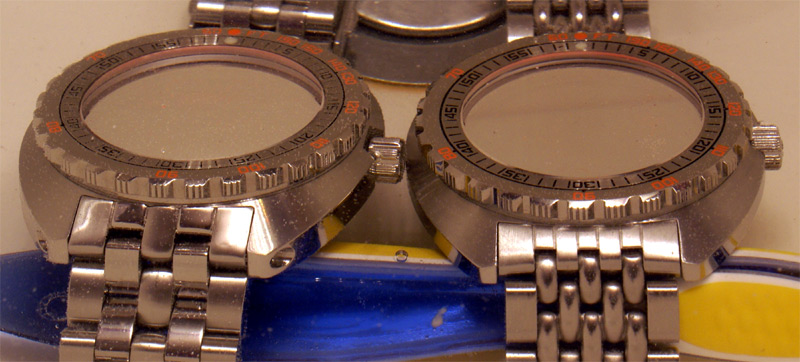 It has often been claimed that a domed crystal will stop the mirror effect associated with flat crystals when used underwater. However, a simple experiment in the bathroom sink shows that the SUB 750T and the SUB 5000T crystals mirror at the same angle. One justifiable reason for using a domed crystal is that a domed structure will be stronger than a flat one for a similar thickness, but I feel that the reason the SUB 5000T has a domed crystal is because it adds depth to the dial and maintains the vintage look and feel.