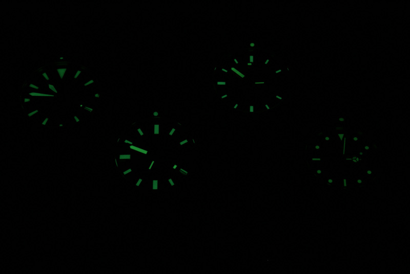 First is the use of metal markers. In the continuing drive to make the SUB dial one of the brightest on the market, the dial was changed from painted markers to large metal ones which were filled with Superluminova. The dial undoubtedly glows brightly in the dark but using metal markers to achieve this has been controversial. The image above shows the lume of; (left to right) Omega Seamaster, SUB 5000T, SUB 750T and Rolex Sea-Dweller.