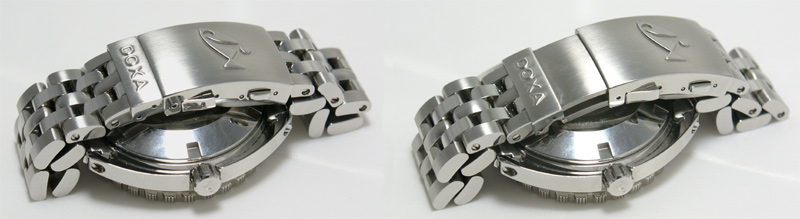 One of the features which the vintage SUB bracelet incorporated and has been high on the wish list is a ratcheting clasp. The original design was very innovative but somewhat fragile. Doxa built on that design and produced a very elegant but more robust solution for the new bracelet. The ratchet mechanism is incorporated into a clasp which also departs from the previous flip lock style clasp. The new clasp uses a push button mechanism.