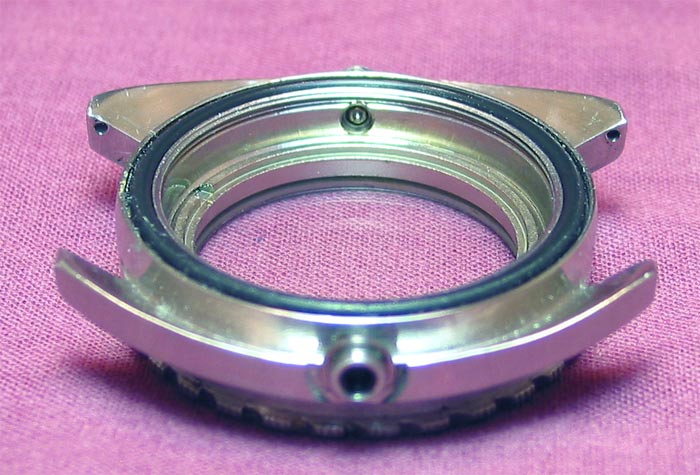 Removing the movement gave me a chance to inspect the inside of the case and the release valve. It sure is a small piece of engineering and basically consists of a non return valve mounted at the 9 o'clock position.
