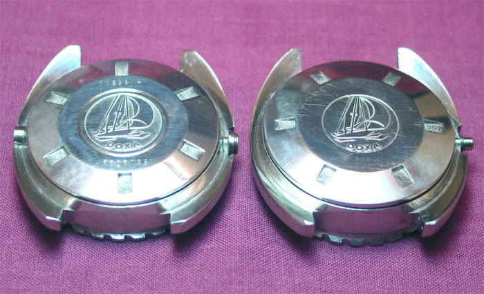 Even though the casebacks if the thinest and thickest vintage SUBs used the Doxa ship logo, there is a subtle difference in them. The Conquistador's logo looks like a medal has been inserted into the caseback, whereas the Sharkhunter's (seen in the above photo) is stamped. Doxa returned to the early look for the new SUB 600T by using a medal insert of the Jenny family fish logo in the caseback. One feature of the Conquistador which is not noticeable until the winding crown is removed and can be seen in the above photo is the diameter of the stem tube. It is a much bigger bore in the Conquistador.
