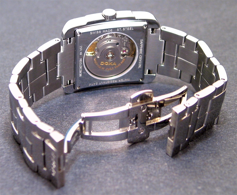 The Deco normally comes with a leather strap, however, I prefer bracelets and hence this review only shows the bracelet. The strap is calf skin and uses the same deployant clasp used on the bracelet. The stainless steel bracelet is very comfortable and certainly not a hair puller. Three nice touches are solid end pieces, a Deployant clasp and the inclusion of 2 half links which make up for the lack of fine adjustments inherent with a butterfly style clasp. The reflection from the purple background I normally use in my reviews just wouldn't let me capture the decorated rotor clearly nor the writing on the caseback so I switched to a darker background for several shots. This one clearly shows the simple decoration on the ETA 2824-2 rotor. It says DOXA and TWENTY FIVE 25 JEWELS SWISS MADE. Regarding the movement, Doxa's webpage shows an image of a Deco which has a slightly different dial with the word CHRONOMETER written on it. This is actually a prototype and never made it into production. After 2 months the Deco shown here is running at -4 seconds a day. I don't think many people would be too unhappy with that accuracy.