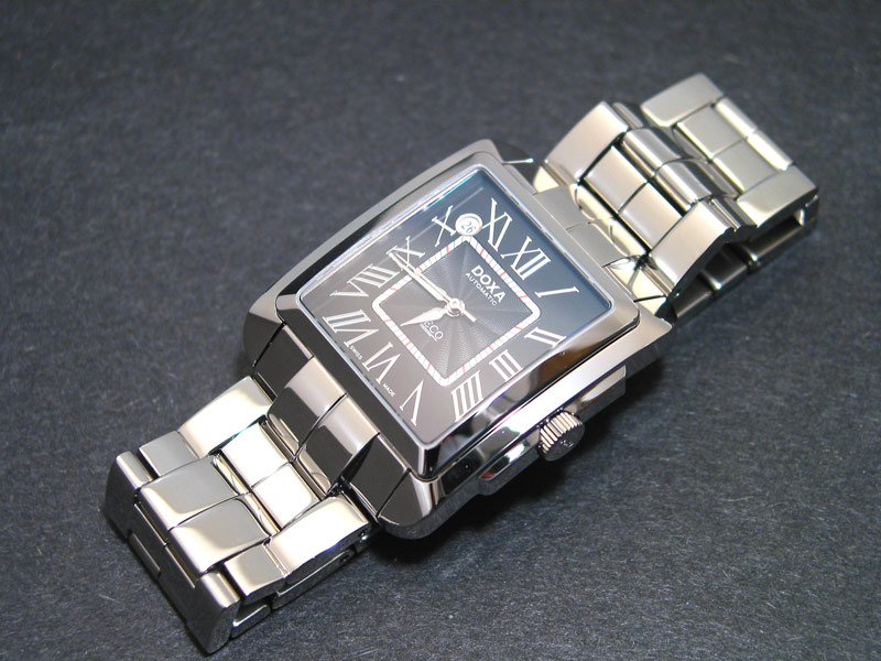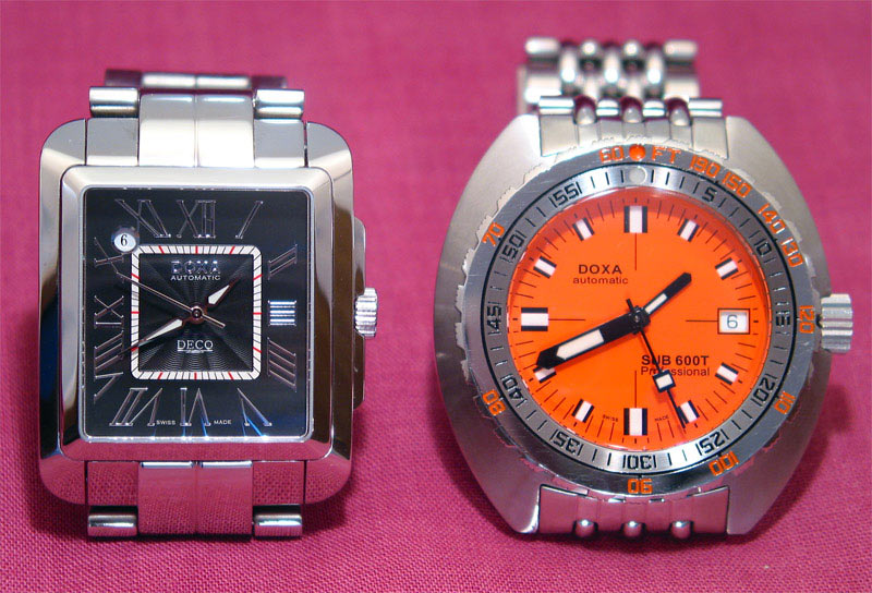 Doxa took the square style of the Grafic and beefed it up with an ETA 2824-2 automatic movement, a Sapphire crystal and Sapphire glass back (which is secured by a screw at each corner). Whereas the Grafic was small and light, measuring: width 30mm (32 with crown), 37mm length, height: 7mm and lug width 20mm, the Deco weighs in with a width of 34mm (35 with crown), 40mm length, height: 10mm and lug width 23mm. The weight is also significantly heavier. With the stainless steel bracelet it weighs 5.3 ounces, which is as much as the SUB 600T with a similar length bracelet. As can be seen from the above photo, the Deco is approaching the size of the SUB 600T.