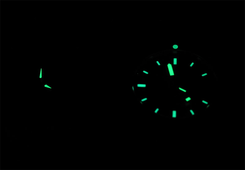 With regard to the dial, there is no luminous material on it. The hands use Super Luminova but they are quite small and so there is not a great deal of luminous material on them. The above shot shows the Deco and the SUB 600T after the same exposure. The Deco's hands are quite legible considering the small amount of luminous surface area, however, at 4 o'clock in the morning I think it would be easier if you just switched on the bedside light to find out what time it was.