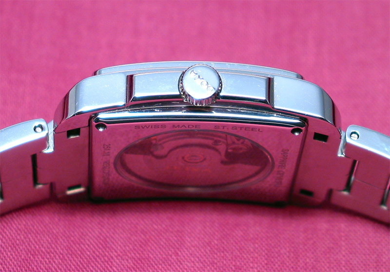 Although the Deco case looks symmetrical on first viewing, closer inspection shows that there is a extra ridge of steel on the winding crown side. At first I thought that this made the case look unbalanced and wondered if the watch would look more "even" without it, but in effect the ridge is really a crown guard.