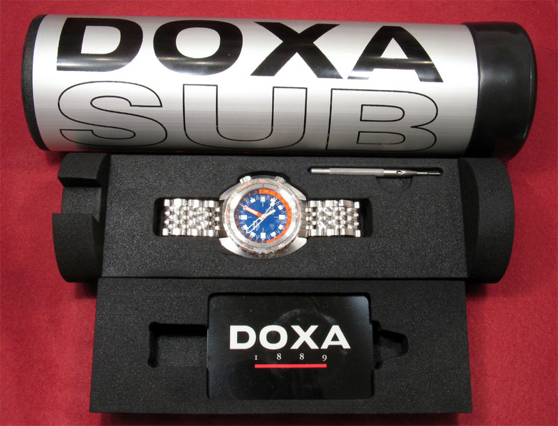 The GMT comes in the 'standard' Doxa SUB packaging which is the aluminium tube and a separate CD case. I've owned almost 20 different Doxa watches in my time but I was really looking forward to getting this one because it was a significant departure from the traditional Doxa SUB. The addition of another skeleton GMT hand is a significant change to the classic SUB design. Then there is the change to the dial and chapter ring. In many ways the dial still retains the traditional Doxa SUB flavour but now there are numbers round the outside. The chapter ring also has changed significantly having now a set of 24 hours markings and half the ring being blue and the other half being orange. Actually I think the GMT SUB 750T is approaching the record for the most numbers on a watch. If you include the date and the non-decompression bezel, the front of the watch exhibits 58 numbers.
