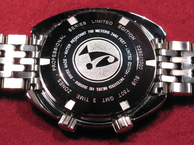 The caseback wording has changed as well. In addition to - LIMITED EDITION - PATENTED BEZEL US 3505808 - SWISS MADE - WATER RESISTANT 750 METERS - 2460 FEET - it also says - PROFESSIONAL SERIES - LIMITED EDITION - XXXX/1000 - SUB 750T GMT - 3 TIME ZONES.