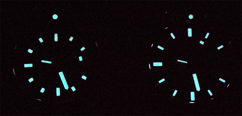Like previous Doxa SUBs, the GMT glows very brightly once the Superluminova has been charged. Because the GMT hand is a skeleton hand there is no luminous material on it so it can't be seen in the dark. In the above image the GMT is compared with the standard 750T. Both watches were charged for 30 seconds and exposed to the camera. The GMT is on the left. The fact that the GMT hand has no luminous material is really of no consequence because, for example, in my case I know the GMT hand will be set 6 hours in advance of the main hour hand, so if I wake and see that it is 3 AM I know it is 9 AM in England. Doxa have confirmed that the new luminous material is double applied and coated with a special substance that protects the Superluminova from breaking or cracking for years.