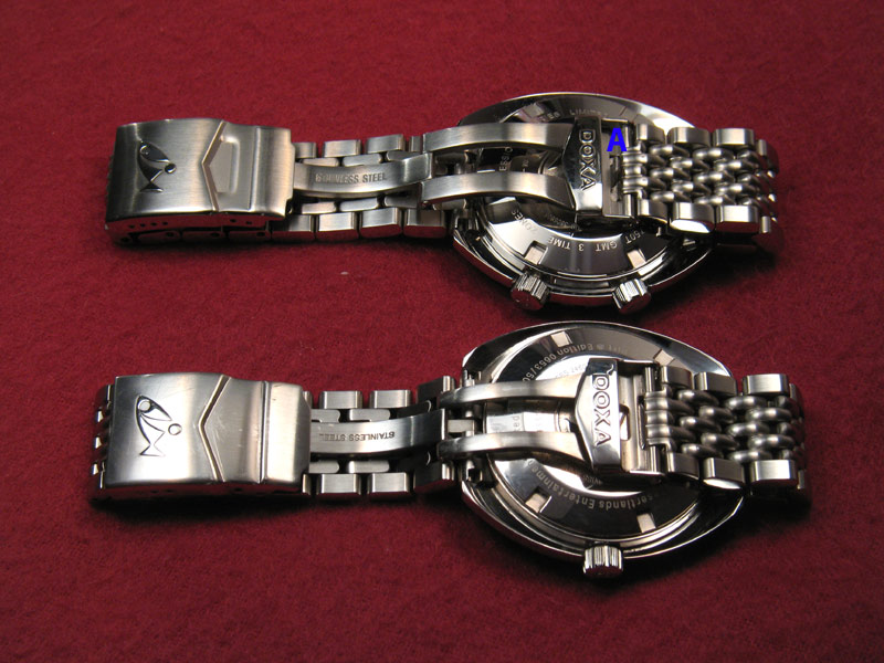 Another virtually un-noticeable change to the bracelet is in the clasp. The gauge of steel is slightly thicker. The clasp pivot pieces have been made wider and the actually lip on the clasp which you insert your finger tip under in order to open it has also changed shape slightly. Also the primary locking mechanism for the clasp has changed design. The GMT clasp now uses a small piece of steel to "grip" the clasp pivot piece. It can be seen just below the blue letter A in the above image. To facilitate easy resizing, Doxa include a tool with a screwdriver bit. The bracelet retains the brushed front and polished sides from the SUB 750T model.