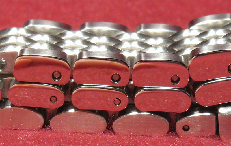Finally a change which is not so noticeable is the bracelet. It still maintains the major dimensions started with the SUB 750T, namely 20mm width over the whole length and 21mm solid endpieces and lug width. The changes are that the thickness of the bracelet has increased slightly and the link pins are screws and not the pin and collar arrangement which was in the initial SUB 600T and 750T watches. The photo above shows the 600T bracelet on the bottom, the 750T bracelet in the middle and the GMT bracelet on top. There is a definite change in design from the 600T to the 750T and an increase in thickness in the GMT bracelet.
