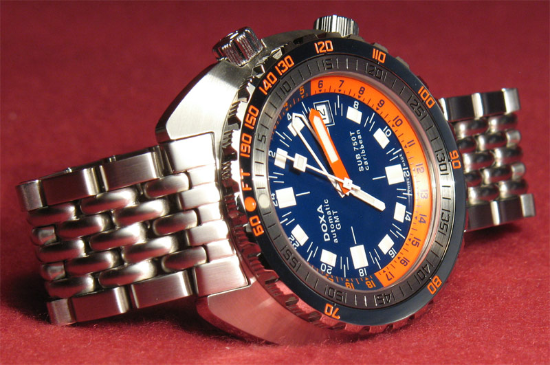For those that don't, they are from a song by Billy Ocean called Caribbean Queen. So what has that to do with a new watch from Doxa? Well actually quite a lot. In September 2006 DOXA introduced a new member of the SUB 750T family. It had a yellow dial and was called a Divingstar, but it was unlike any SUB seen before. It was instantly recognizable as a DOXA SUB because it had the classic Tonneau case and the non-decompression bezel but it also had something extra; another crown and another hour hand. The watch was the GMT SUB 750T. Many people had voted in an online poll for a GMT version of the SUB 750T and DOXA responded with the GMT SUB 750T Divingstar. The case and bracelet are based on the standard SUB 750T with the usual 120 click non-decompression bezel, sapphire crystal and 'ricebead' bracelet with divers extension hidden in the double locking clasp. The GMT has the same dimensions as the SUB 750T (Width 45mm, Length 47mm, Height 14mm and Lug Width 21mm). Like the SUB 750T, it is a big watch, but also like the 750T, it is a comfortable watch. A full review of the 750T can be found here. However, there are some obvious and some not so obvious differences. First the obvious ones. The addition of a second crown is by far the biggest change to the iconic Doxa SUB Tonneau case. The upper crown has only one function and that is to rotate the 24 hour chapter ring. The lower crown is used to set the date and time. The dial is the traditional DOXA standard which incorporates the large luminous markers but the chapter ring has been modified to include the 24 hour numerals. The final visible modification is the addition of a 'skeleton' hour hand for the second time zone. A third time zone can be displayed using the skeleton hour hand pointing to a 24 hour scale on the separately adjustable inner bezel. The initial issue of the GMT came in the yellow Divingstar livery but by November DOXA had listened to its customer base and released an orange Professional version and a blue Caribbean which not surprisingly has been nicknamed the Caribbean Queen and hence the link to the song because "now we are all sharing the same dream and our hearts beat as one, no more love on the run. OK, OK really cheezy, but what the heck, it sounds good. DOXA have also indicated that other colours may follow so ultimately there may be a GMT SUB 750T Sharkhunter and Searamber as well.