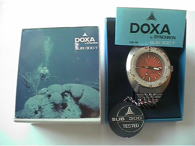 One of the things that Doxa get requested for the most is a replacement bracelet for the SUB series of watches. The original 'rice grain' bracelet that shipped with the SUB 200 T.Graph was innovative for its day. On closing the clasp, the length could be adjusted with a ratchet, sliding movement and the two pieces at either side of the clasp were spring loaded and allowed the bracelet to expand when the wrist was flexed. Fancy, it was, but strong and durable, it wasn't. The bracelets tended to self destruct fairly quickly. This wasn't surprising as the watch itself had a big, heavy case and the bracelet wasn't up to dealing with it. The extra bracelet I ordered with the Poljot is a heavy stainless steel unit with a side mounted push button clasp. It is reminiscent of the movement on the Seiko bracelet. It completely transformed the Poljot when I replaced the orange strap with it. One word of warning. It was a b#$@%&d to resize. It uses normal link split pins but they were so stiff that I even broke my link splitter trying to remove a few links. The links on the 200 T.Graph are held together by screwed pins, not unlike those used on the Doxa SUB 300T reissues. It is now clear that Doxa tried very hard to make the reissue as close to the old SUBs as possible.