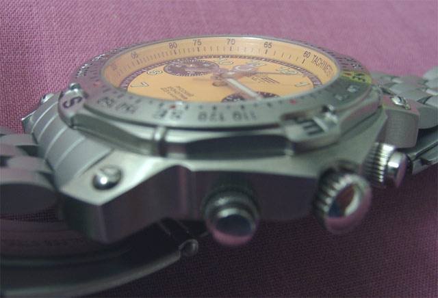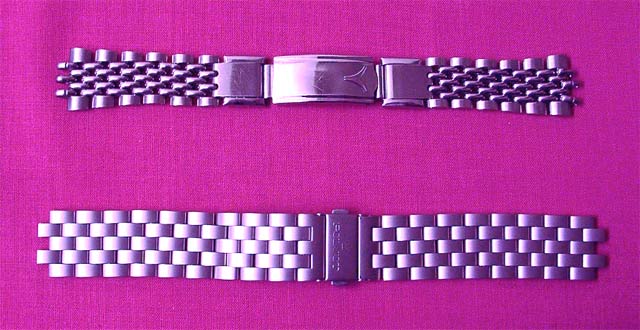 One of the things that Doxa get requested for the most is a replacement bracelet for the SUB series of watches. The original 'rice grain' bracelet that shipped with the SUB 200 T.Graph was innovative for its day. On closing the clasp, the length could be adjusted with a ratchet, sliding movement and the two pieces at either side of the clasp were spring loaded and allowed the bracelet to expand when the wrist was flexed. Fancy, it was, but strong and durable, it wasn't. The bracelets tended to self destruct fairly quickly. This wasn't surprising as the watch itself had a big, heavy case and the bracelet wasn't up to dealing with it. The extra bracelet I ordered with the Poljot is a heavy stainless steel unit with a side mounted push button clasp. It is reminiscent of the movement on the Seiko bracelet. It completely transformed the Poljot when I replaced the orange strap with it. One word of warning. It was a b#$@%&d to resize. It uses normal link split pins but they were so stiff that I even broke my link splitter trying to remove a few links. The links on the 200 T.Graph are held together by screwed pins, not unlike those used on the Doxa SUB 300T reissues. It is now clear that Doxa tried very hard to make the reissue as close to the old SUBs as possible.