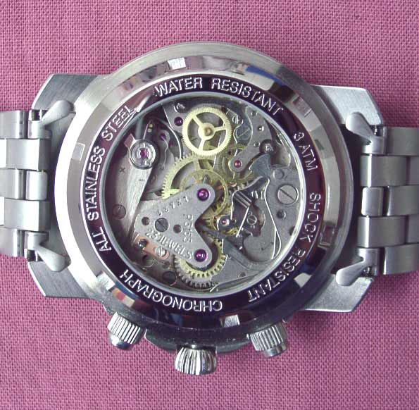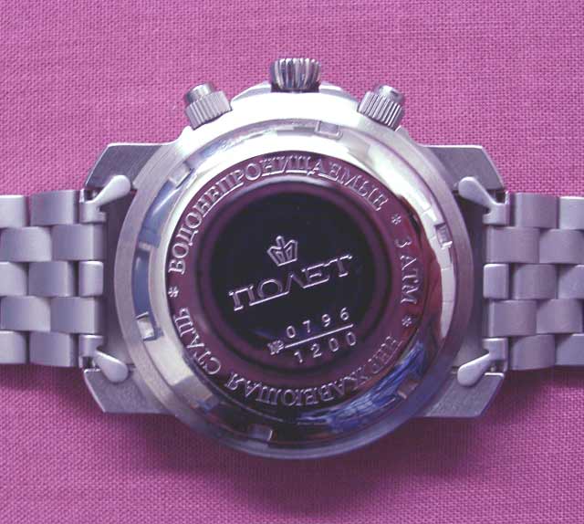The Poljot movement is fairly well finished and I ordered a glass caseback for the watch. This shows the movement very nicely. The original caseback says that it is stainless steel and water resistant to 3 atmospheres. This is 30 meters or 100 feet, so the Poljot could easily be used for scuba diving. However, the crown is not screw down and I'd take the depth rating with a pinch of salt until it was proven to be reliable. The SUB 200 T.Graph is rated to 200 Meters or 666 feet. Again, if I was buying a 30 year old example, I'd be very wary of diving with it no matter how well it was looked after.