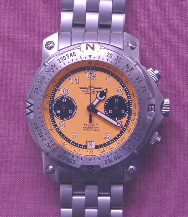 The photo above shows the Poljot dial up close. This image is probably the closest to the actual colour of the dial. Just like the SUB 200 T.Graph it has 2 subdial indicators and a date window. The minute counter is at the "3 o'clock" position, the date window at "6 o'clock" and the second counter is at the "9 o'clock" position.
