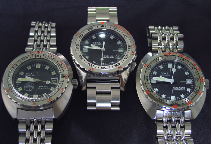 This review is more of a pictorial essay as I have already done an extensive review of the SUB 600T. I managed to get most of the Doxa Sharkhunter editions together at the one time. The photo above shows the vintage SUB 300T, the SUB 250 and the new SUB 600T (I added the orange 600T Professional in the background as a bit of colour relief). Missing from the set is the SUB 300T Reissue. Interestingly enough, of the 1,000 pieces produced, very few of them come up for sale. There is far more secondhand traffic in the orange dial Doxas.