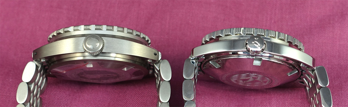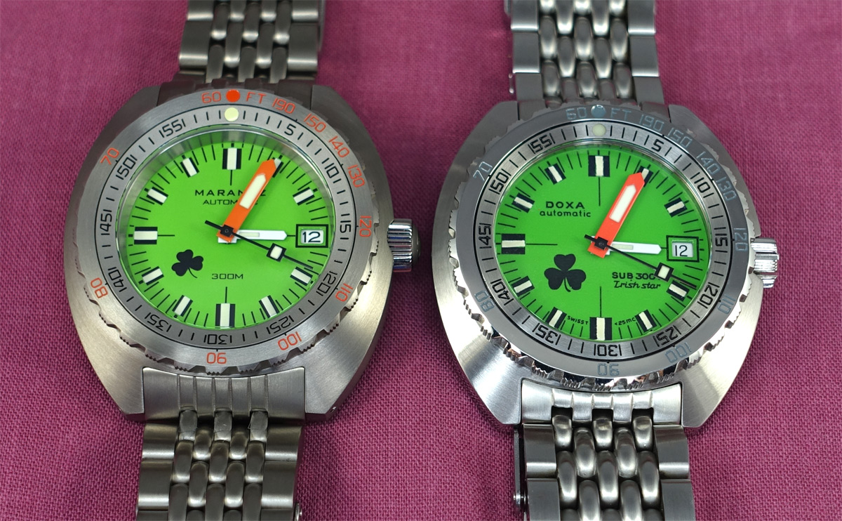 Titanium is lighter than steel and even though the Samui case and SUB 1200T cases are different, they are close enough to compare. The Samui case is based on the last of the Synchron era SUBs and was the thickest of the 300T models. Sized for a 6.75 inch wrist, the DOXA Irishstar weighs 167 grams, the Maranez Irishstar weighs 118 grams.