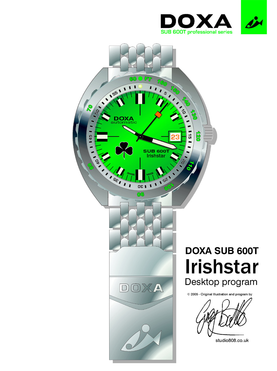 I can't remember the exact date I came up with the idea of the DOXA Irishstar. I do remember talking to Rick Marei about a green dial SUB probably in 2004. Greg Bottle who did the fantastic layout of the 40th Anniversary book did this drawing for me in 2005 and I then used it to have a dial made up in 2006 which I fitted into a SUB 300T Reissue.