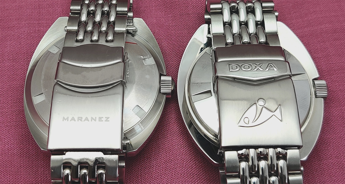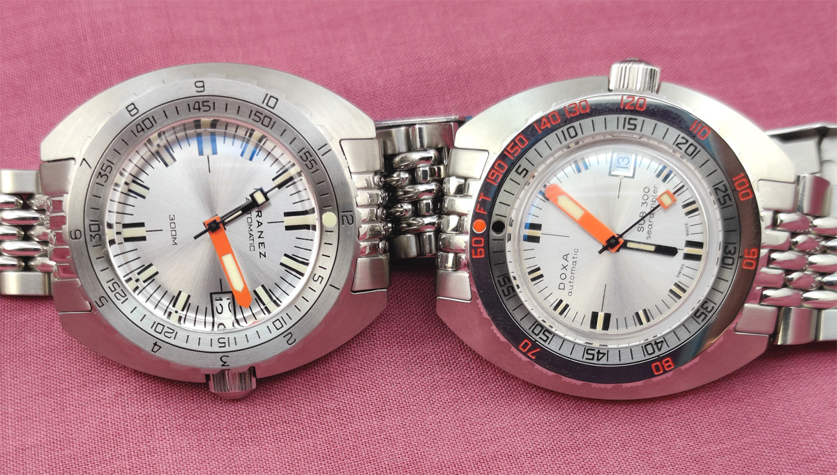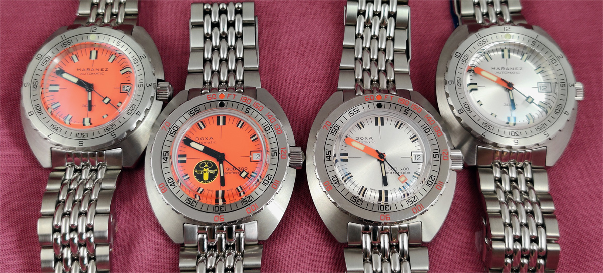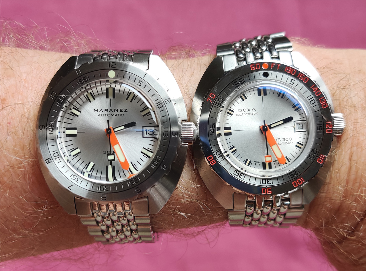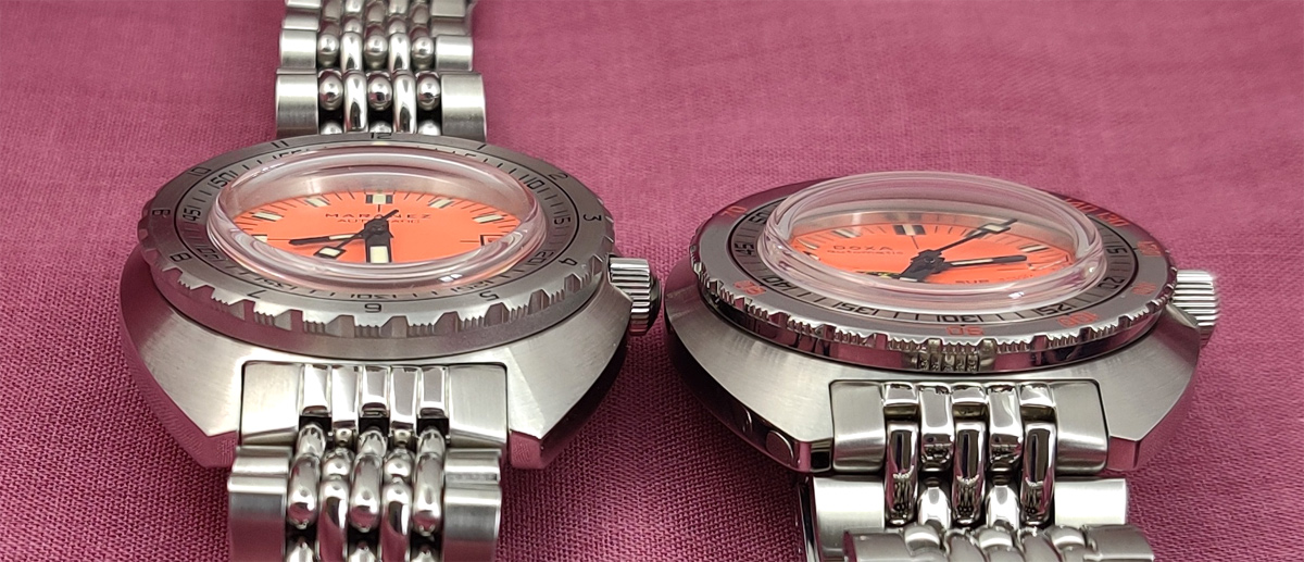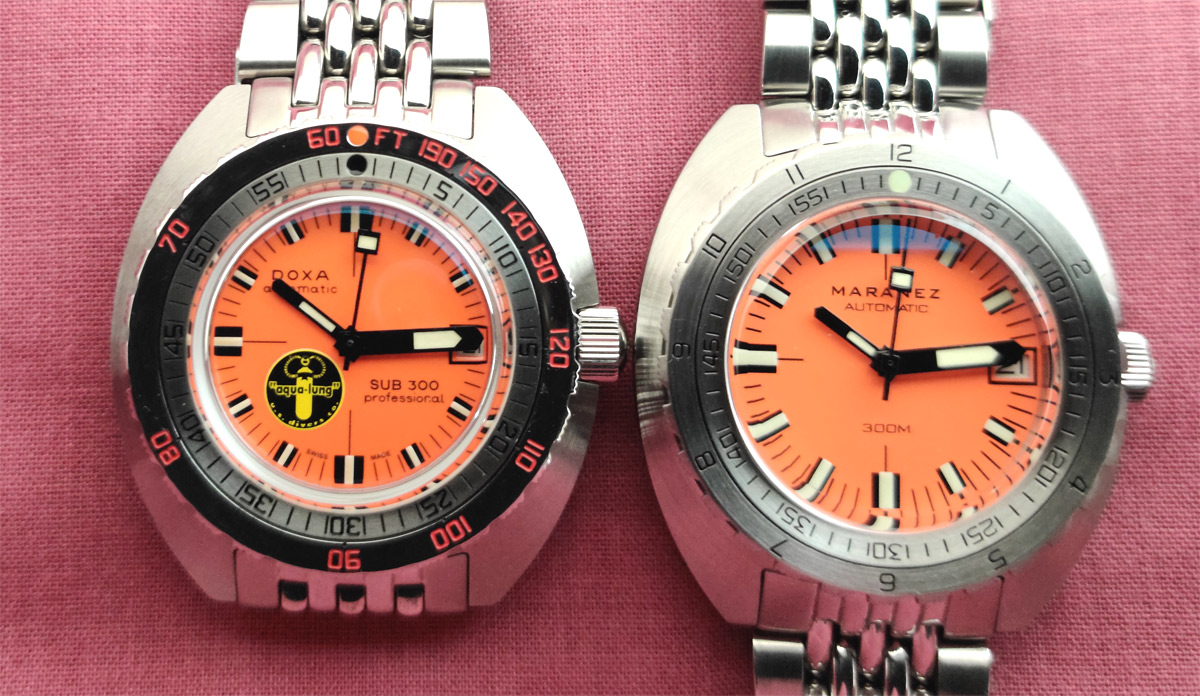 Ladies and gentlemen may I present, in the red corner, the reigning champion: the Doxa SUB 300. Based on the classic vintage SUB from 1967 but updated with a modern crystal and bracelet and weighing in at $2490. In the blue corner weighing in at a positively anorexic $399 is the pretender to the throne: the Maranez Samui Vintage also known as the 3rd generation Samui. And just in case you are wondering. Yes, I would say every resemblance to the SUB 300 is purely intentional.