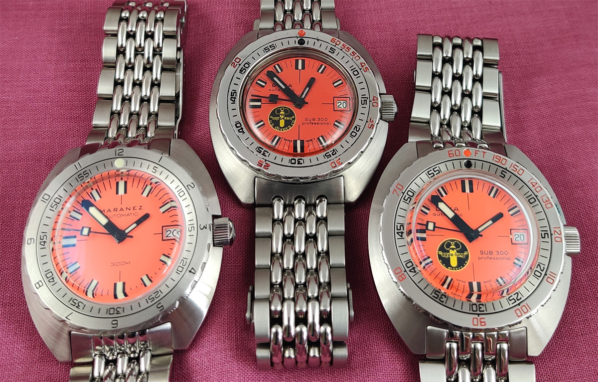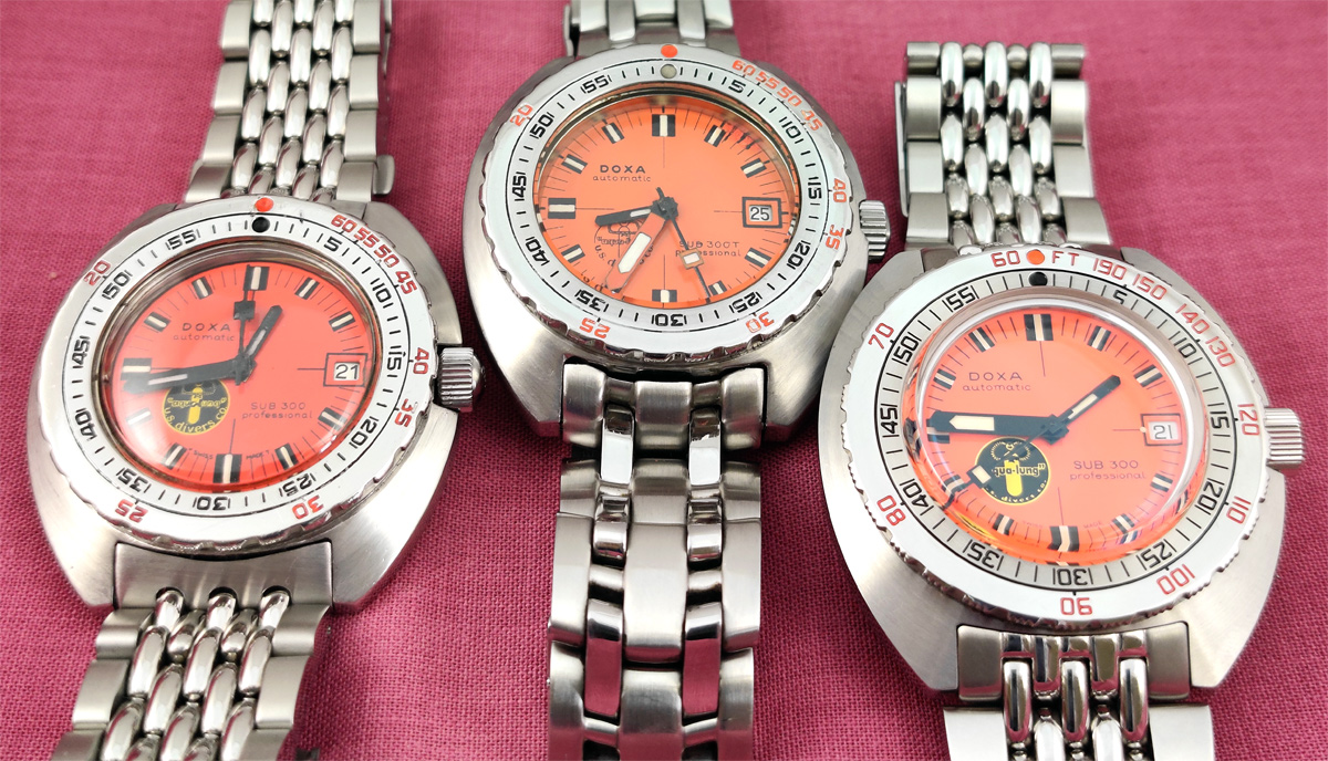 So let's start the ball rolling with the Doxa SUB 300. It was the first of the Doxa SUBs and was presented to the public in the spring of 1967 at the Basel Watch Fair. It really only lasted for about a year and was quickly superseded by the larger SUB 300T. It was resurrected for the SUB's 50th Anniversary as a limited edition with the US Divers logo and was the last watch of the Marei era and became a regular part of Doxa's watch stable when the new management took over when the ICE era started in 2019. The image above shows the vintage models SUB 300, 300T and the 50th Anniversary SUB 300.