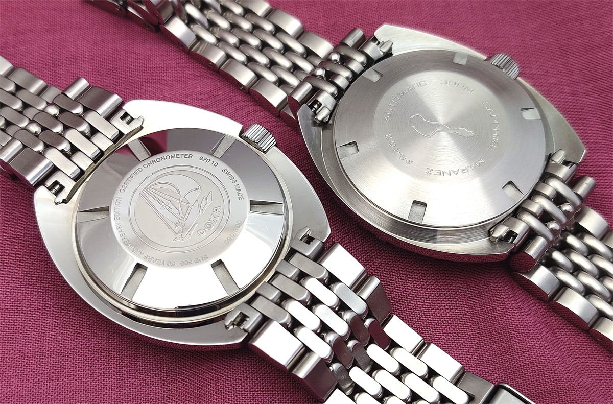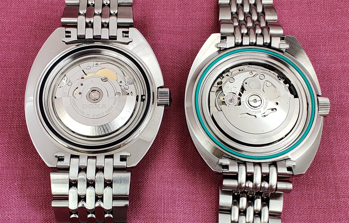 The casebacks are also a different size and are not interchangeable. And it is at the back of the case where there is definitely a much better finish and look on the SUB 300. For starters, the underside recesses on the SUB are polished as is the caseback. The Samui is completely brushed and the finish seems to be much coarser than the rest of the case. The SUB 300 has the classic Doxa sailing ship and even though the back of a watch is seldom seen, the Doxa really is a class above in this case.