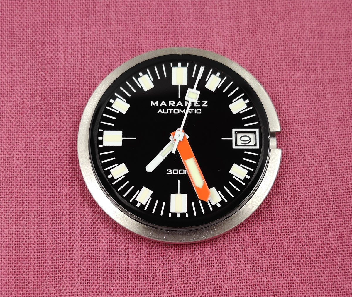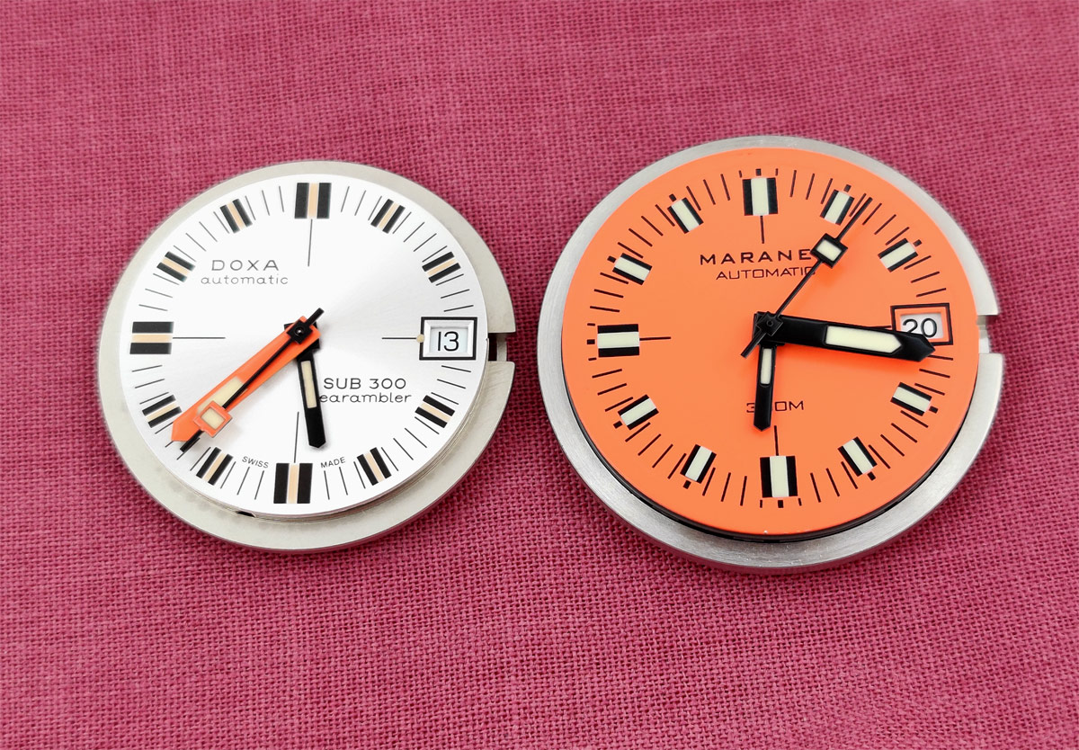 The photo above also shows the subtle difference in the hands. The hour hand lume is a little shorter on the Maranez but on the minute hand it is a little longer. The square lume pot on the seconds hand is closer to the edge of the dial on the Doxa.