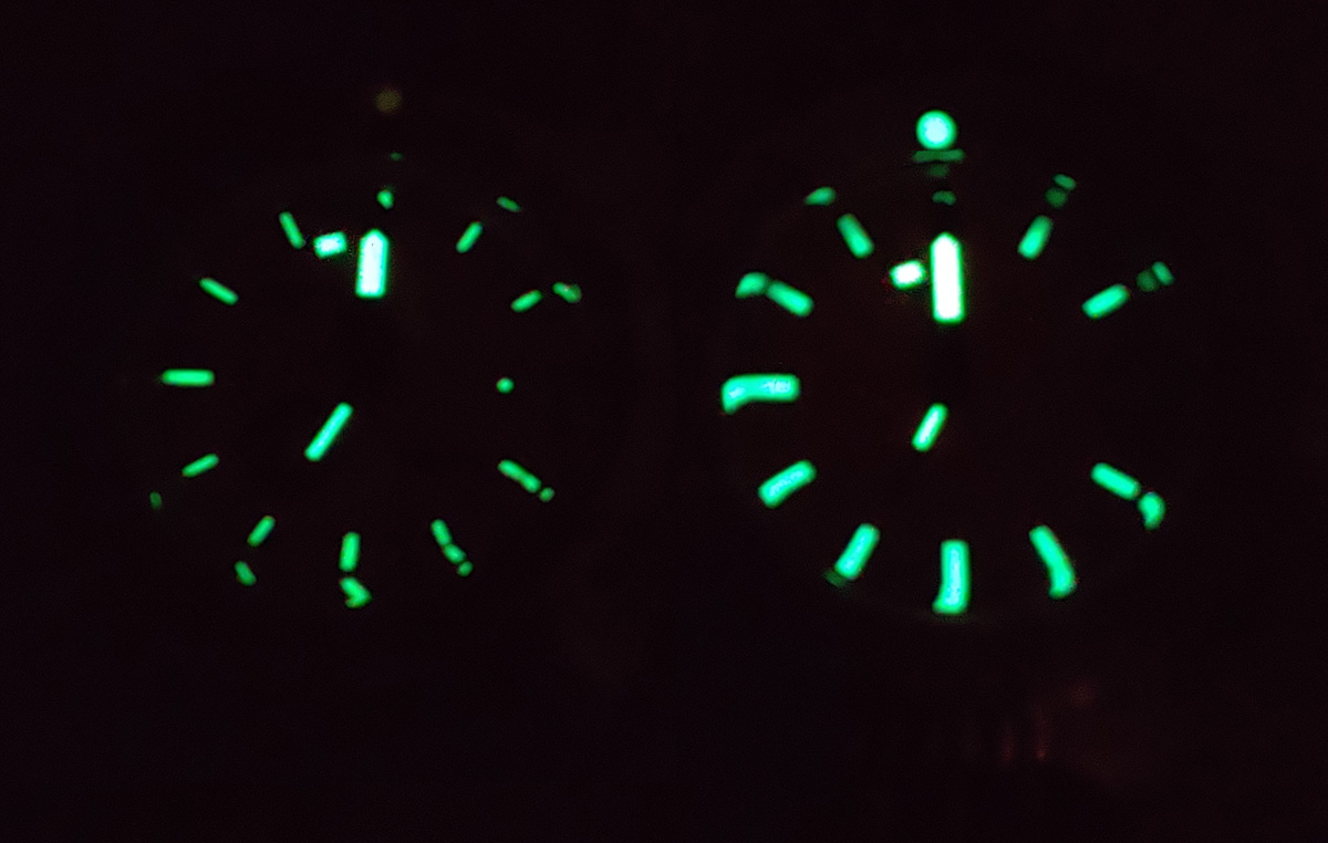 Both the Doxa and the Maranez use Superluminova luminous material on the hands and dial and both glow very well when activated by UV light. The Samui dial has wider luminous strips which, not surprisingly, means that the dial is just a lot brighter than the SUB 300. You can see from the image above that the luminous pip at 12 o'clock on the bezel glows brightly too. If you look closely at the same position on the SUB 300 bezel you will see a very faint glow. It seems that there is some luminous material in the red paint used there. The image also shows that depending on the viewing angle the raised sides of the crystal will distort the luminous glow from the markers.
