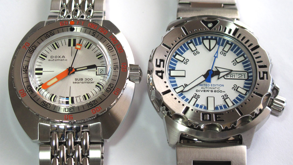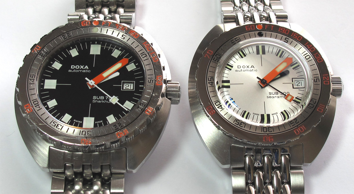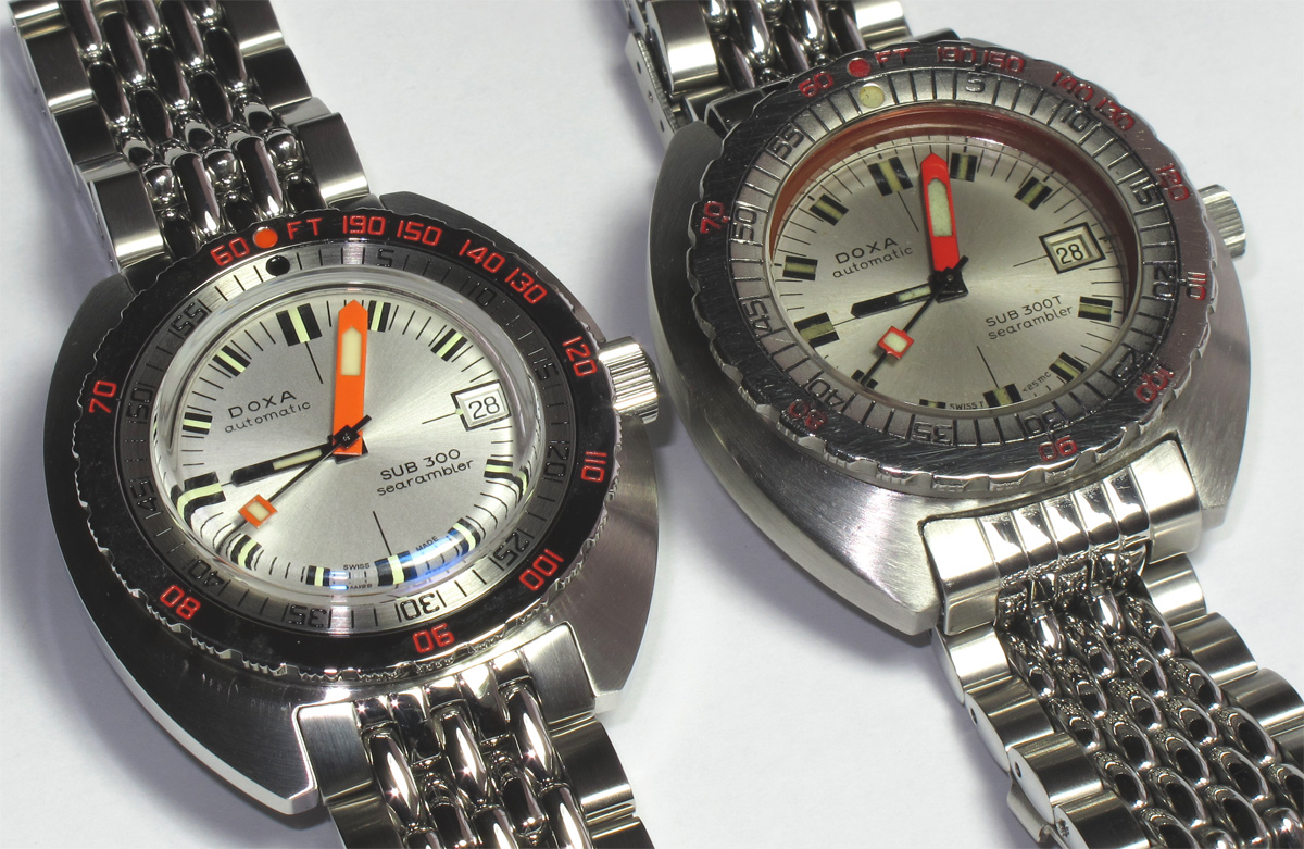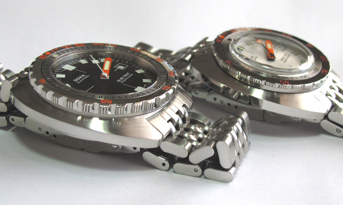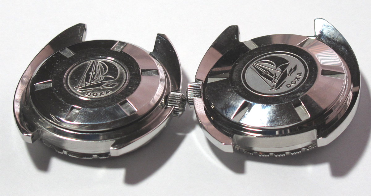 The modern version is the same length and width. Due to a deeper caseback the height to bezel is now 11mm and because of the sapphire domed crystal the overall height is now 14mm. The bezel is now 120 click and has the Imperial Dive Table numbers as opposed to the modern Metric units but the caseback has retained the original DOXA ship rather than the modern Jenny logo.