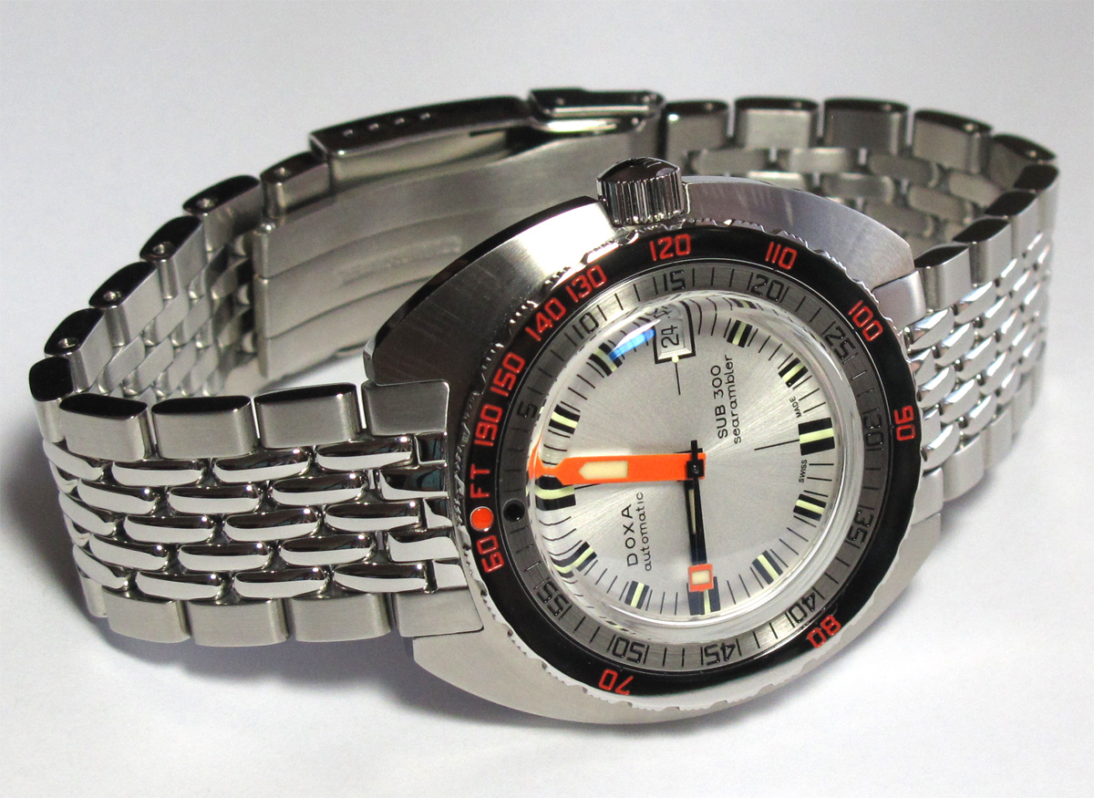 The original SUB 300 utilized a ricebead bracelet which incorporated both expandable links and a rachet mechanism to accommodate the thickness of a wetsuit and how it compressed on deeper dives. For the modern SUBs, DOXA have used different bracelets which have incorporated a racheting clasp and ricebead style. Recently they came up with a bracelet which paid homage to the original one with individual beads. They have used that design but in keeping with the vintage SUB 300, they tapered the last few links to meet up with the edges of the case. (NOTE: this watch is a prototype and the bracelet used does not have the tapered links).