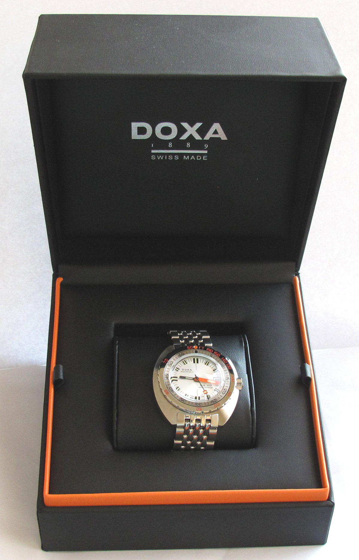 First off let me say that this is a prototype watch. It should be how the final release version looks, except for lettering on the caseback and the bracelet. More on that later. DOXA shipped it to me in a really nice "leather" presentation case rather than the Aluminium tube which has been used for the modern SUBs.